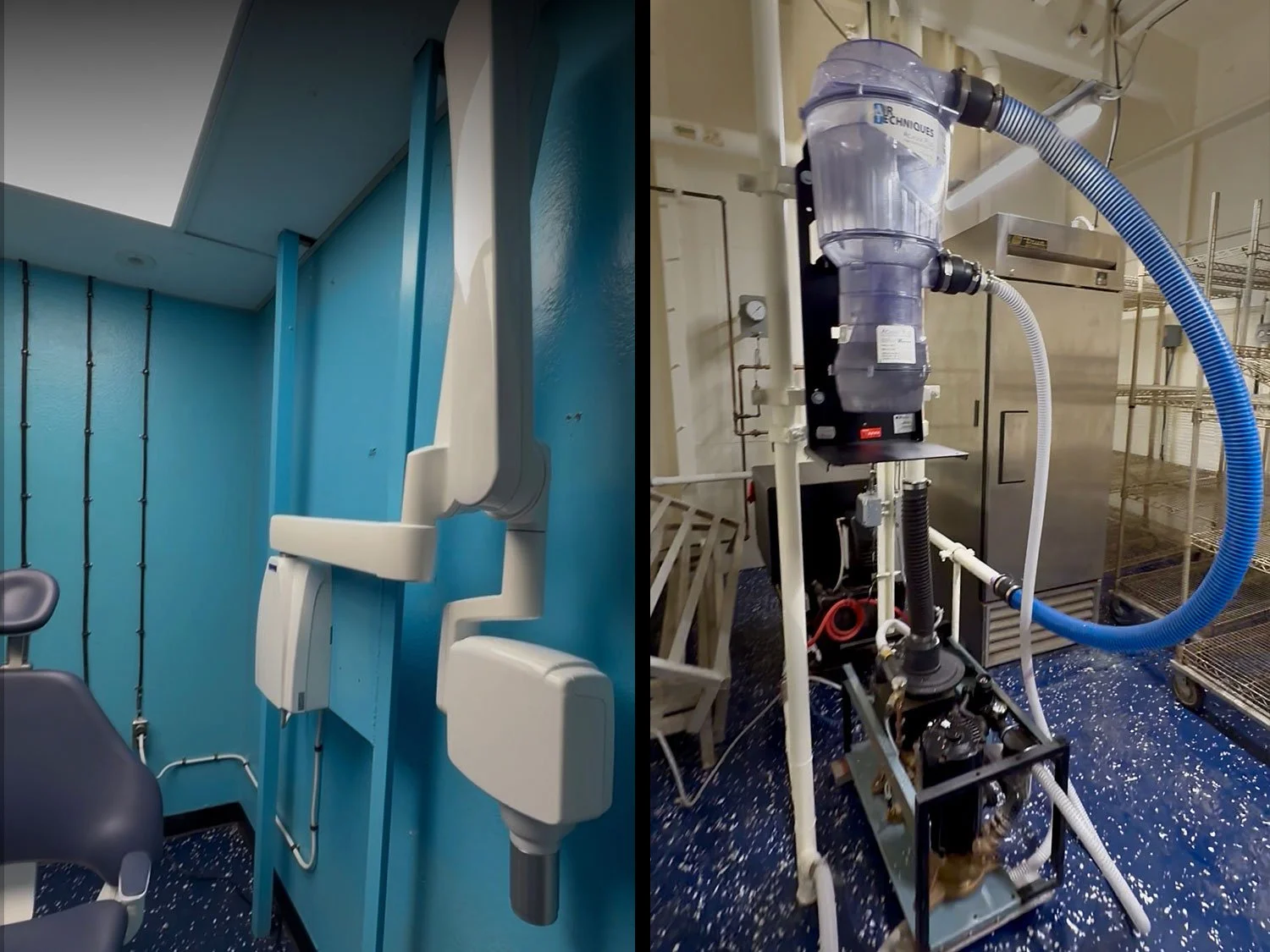 Equipment includes the UMF Medical Exam Table; Ultradent VALO™ Cordless Curing Light; Zyris® Isolite Pro Dental Isolation System: Burton Medical AIM® LED Procedure Floor Light: Baxter Welch Allyn Connex Sport Vital Signs Monitor, h2olabs Water Distiller: Buffalo Dental Manufacturing Sta-Vac™ Vacuum Foaming System, Dentsply Sirona Cavitron® Select SPS™ Ultrasonic Scaler: Planmeca ProX™ intraoral and Planmeca ProMax® S2 extraoral X-ray units, Planmeca Pro50™ dental chairs and Planmeca Compact™ i3 dental delivery units with Star handpieces and Planmeca Solanna® operating light, along with Crown Seating stools. Additional components include sterilization centers, UGS Medical Instrument Storage Carts, and Air Techniques Dental Air Compressors, Vacuum Pumps and Acadia Plus Amalgam Separators to provide compliant wastewater management.